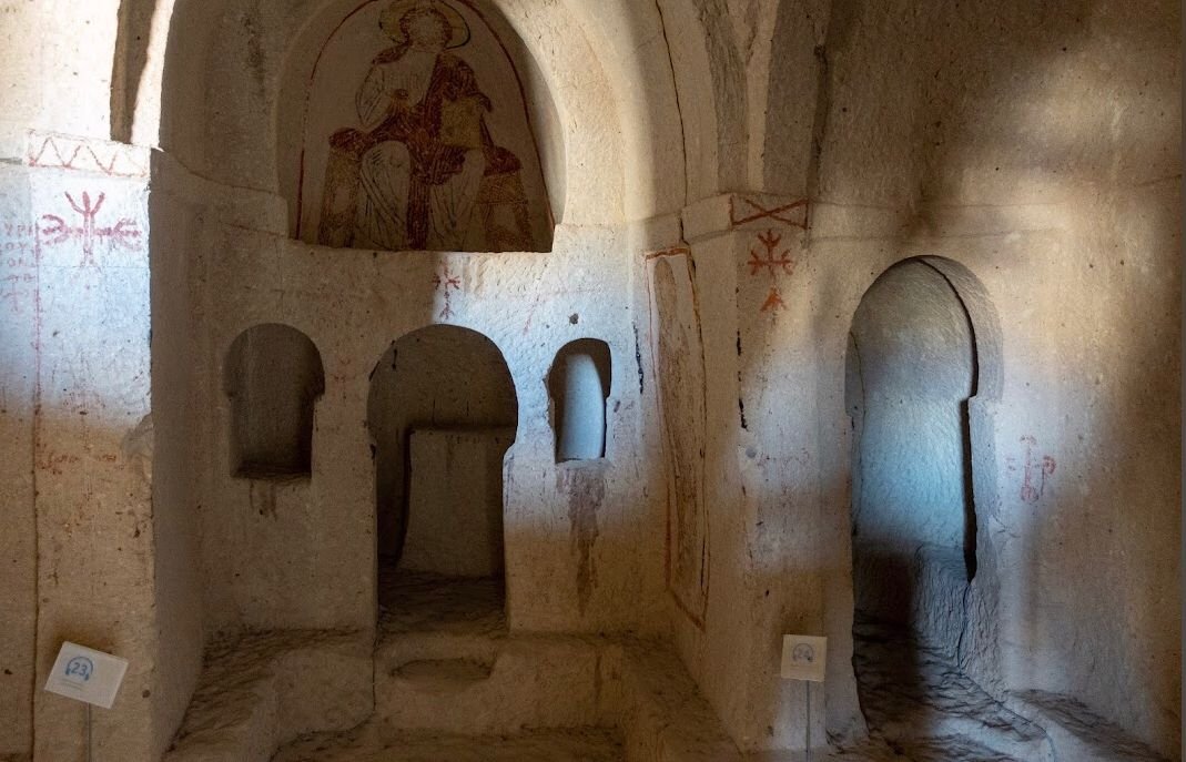 One of the most significant structures in the museum is the Tokali Church (Buckle Church). Known for its size and artistic sophistication, it features frescoes that span different periods, offering a comprehensive view of Cappadocian art. The church’s blue-dominated color palette is especially striking and adds a unique charm to its interiors.