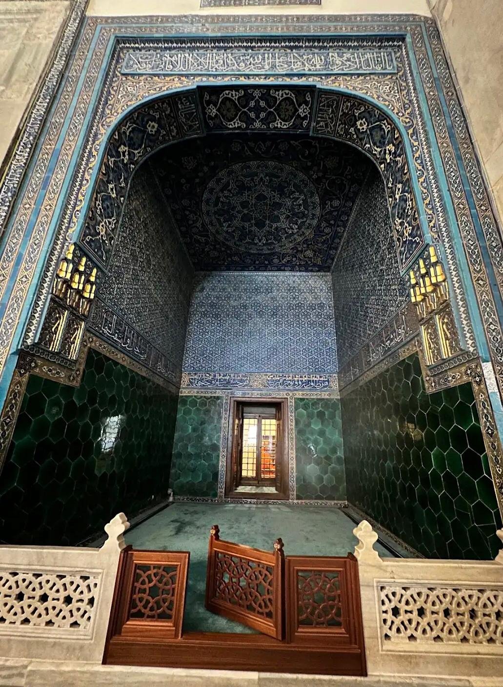 Stepping inside the Green Tomb, visitors are greeted by an equally mesmerizing interior. The walls and dome are adorned with floral designs, Quranic inscriptions, and ornamental motifs in shades of blue, white, and gold. The centerpiece of the mausoleum is Sultan Mehmed I’s sarcophagus, which is also covered in intricately decorated tiles. Surrounding the sultan’s tomb are smaller sarcophagi belonging to his family members.