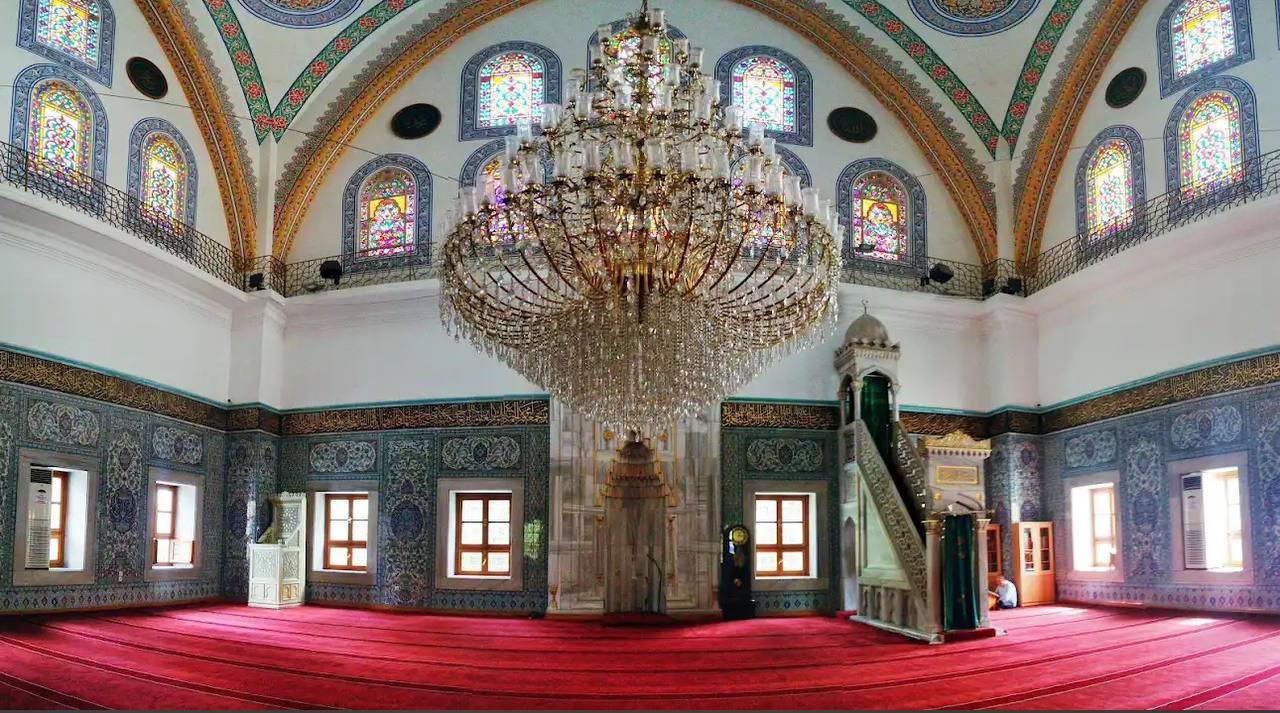 The mosque’s interior is equally breathtaking. The main prayer hall is vast and luminous, with natural light filtering through stained-glass windows and reflecting off intricate Iznik tilework and hand-painted decorations. The chandelier at the center of the dome is particularly striking, designed to both illuminate and enhance the grandeur of the space. Ornate Arabic calligraphy featuring verses from the Quran adorn the walls, offering a meditative environment for worship and reflection.