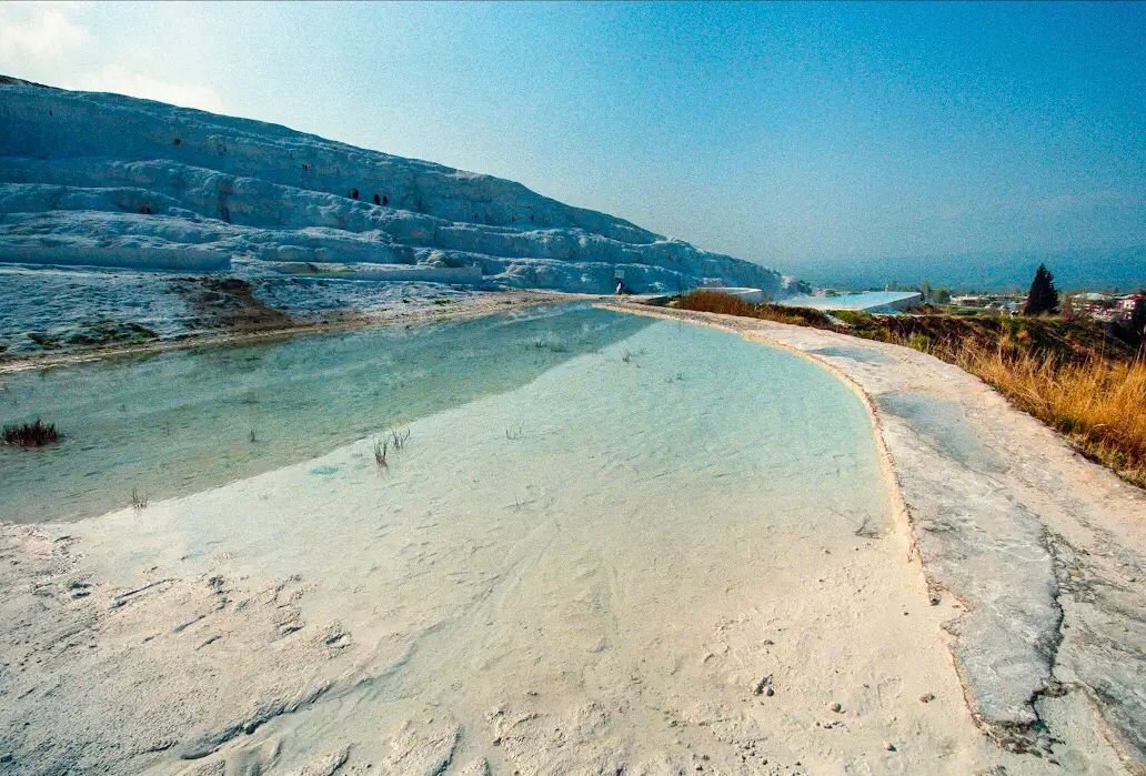 The travertines of Pamukkale were created over thousands of years by mineral-rich hot springs. The water emerges from the ground at a temperature of around 35-100°C (95-212°F) and contains high concentrations of calcium carbonate. As the water flows down the slopes, it cools and deposits calcium carbonate, which eventually hardens into travertine. The result is a series of cascading white terraces filled with turquoise pools that resemble frozen waterfalls. The unique formation process gives the landscape its ethereal beauty and makes it one of the most photogenic locations in the world.